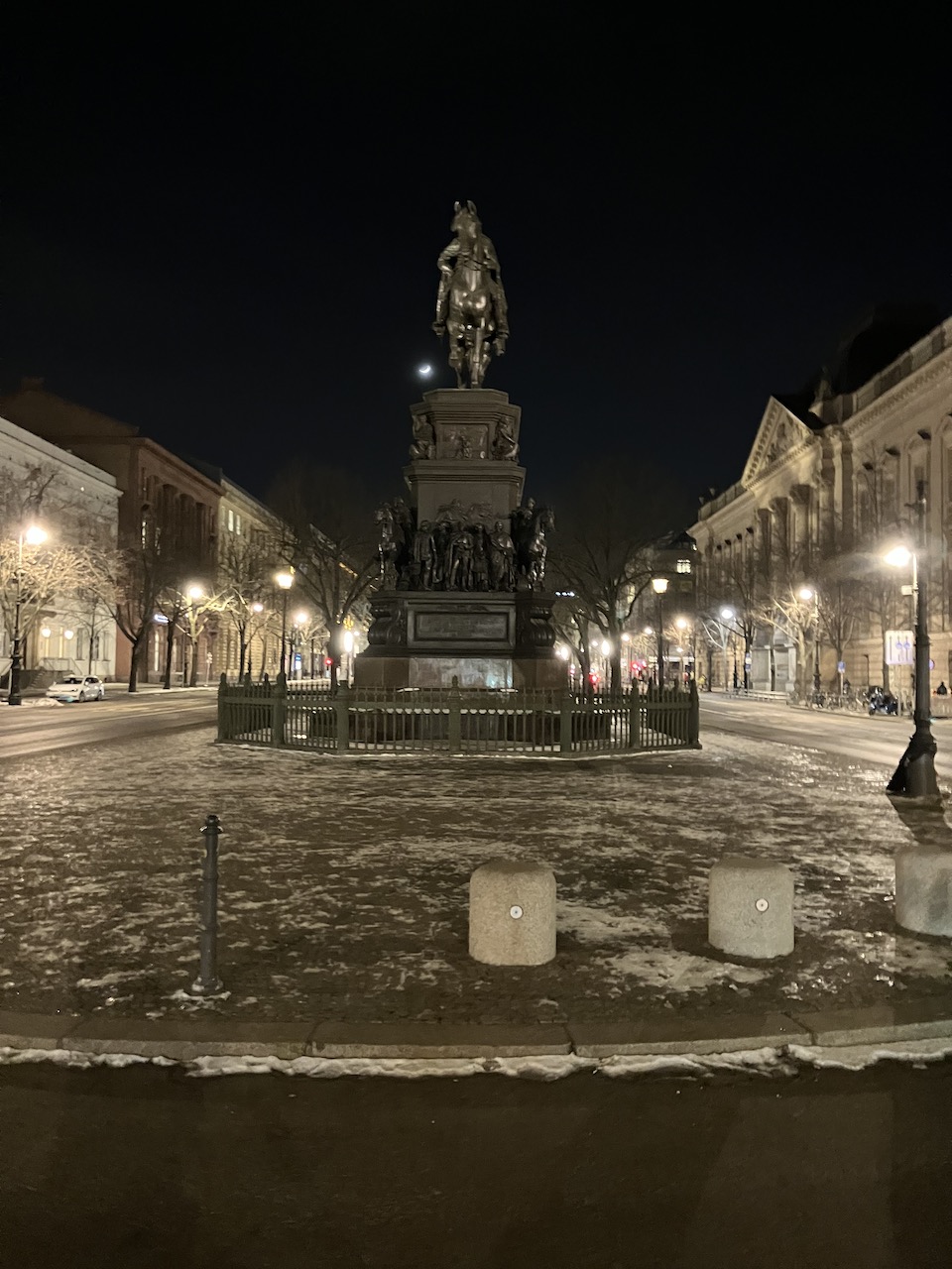 Da kommt das Reiterstandbild von Friedrich „dem Großen“ auf mich zu, wie es sonst nicht der Fall ist. Unterm rechten Steigbügel des Königs hängt der Mond, eine ganz zarte Mondsichel, schlank wie die Mondsichel in der Flagge der Türkei. Aber anders als dort, liegt sie horizontal im Abendhimmel. Es ist zunehmender Mond.
