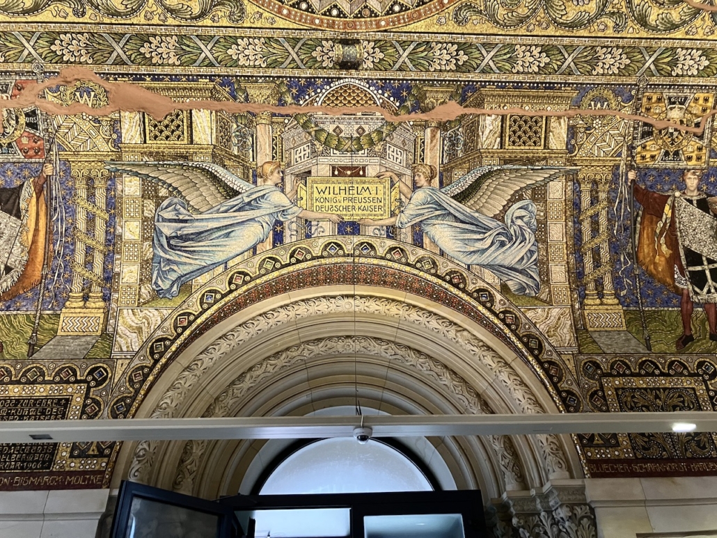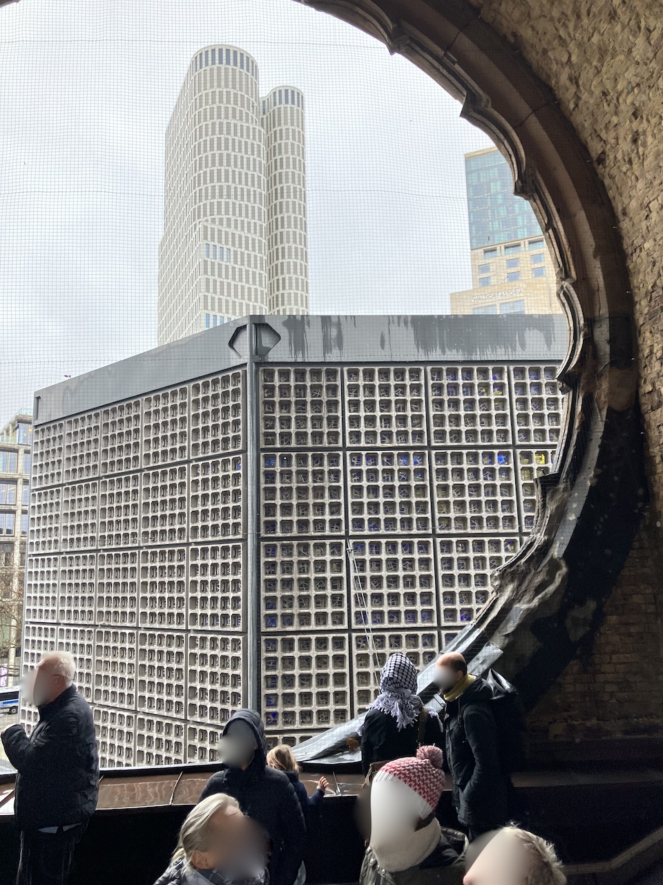 Kim aus Lübeck hat Kunstgeschichte studiert und führt uns durch die Bildergeschichten der Gedenkhalle: die abgebildete Lebensgeschichte von Wilhelm I., der fehlende Kopf von Friedrich III., der abgebrochene Schnabel des Adlers. Anschließend gehen wir raus, durch den ehemaligen Haupteingang der Kirche, stehen vor dem großen Rosettenfenster ohne Glas. Später stehen wir oben, ein Stockwerk höher, und blicken durch dieses Riesenfenster aus der Ruine heraus, sehen „Zoofenster“ und „Upper West“. Das Fenster liefert den zwei Hochhäusern einen (im wahrsten Sinne des Wortes) „ausgefallenen“ Bilderrahmen. Das Eckige sitzt im Runden.