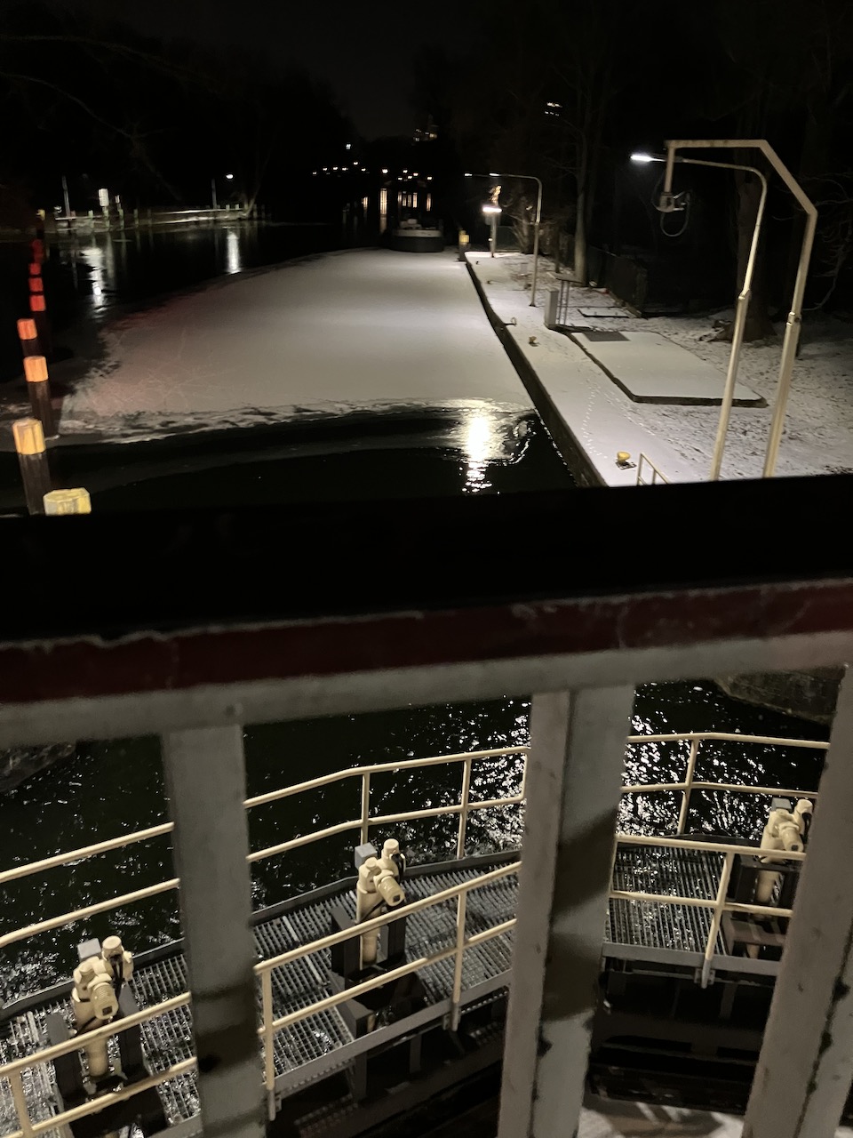 Als ich durch den Tiergarten durchs Gaslaternenmuseum fahre und über die Schleusenbrücke will, bleibe ich stehen. Zu schön ist der vereiste und mit Schnee bedeckte Landwehrkanal. Er ist mir ein Foto wert, und ich ziehe dafür gerne meinen linken Handschuh aus. Da merke ich, dass die Hände warm geworden sind. Weiter an der neuen, nachts beleuchteten Zoo-Pagode vorbei, ebenso am Löwentor, radle ich am Rande des Hardenbergplatzes entlang, muss plötzlich absteigen und das Rad schieben, weil der Gehweg durch ein Baugerüst führt. Vor mir laufen langsam Leute, und ich werfe den Blick kurz ins Erdgeschoss der Location, in der früher mal MacDonalds drin war. Heute ist da Risa drin.