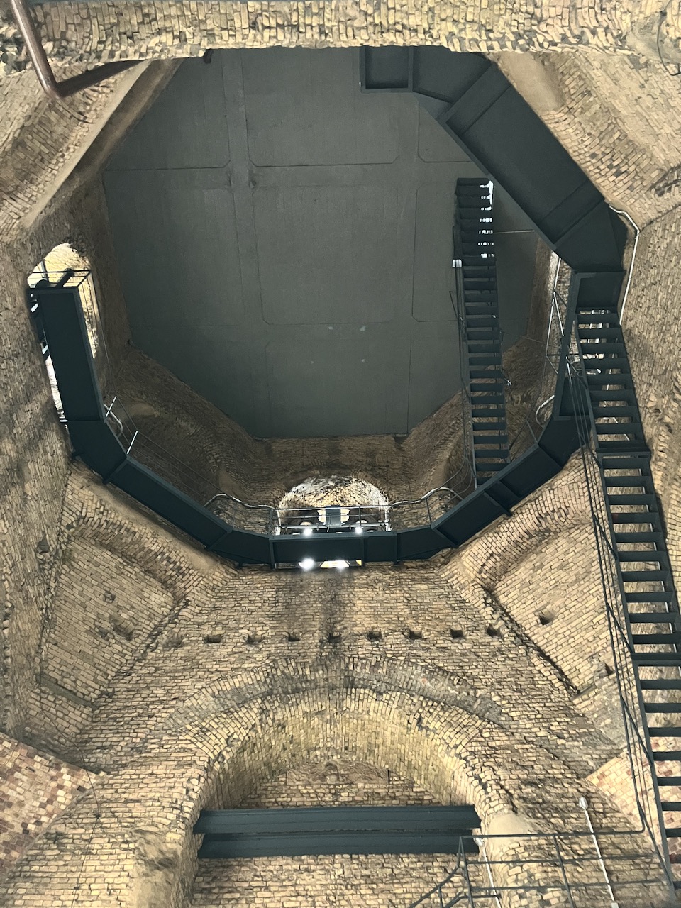 Von hier aus blicken wir hoch in den Turm. Treppen mit Geländer führen an den rohen Wänden hinauf. Eine graue Decke, ganz oben, verhindert die offene Sicht in den Turmhelm. Und genau das wird sich ändern. Bald fällt der Himmel über Berlin herein, Tageslicht auf die Orgelempore, auf der wir stehen.