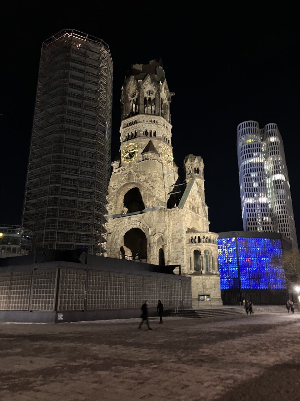 Ich gehe um die Ecke und habe seit dem Brandenburger Tor wieder das Gefühl, in der Stadt zu sein. Der Zoo-Palast strahlt wegen der „Berlinale“ in warmem Rot und Orange, und auf der anderen Seite der Budapester Straße erscheint endlich die beleuchtete historische Turmruine der Gedächtniskirche. Ich habe mein Ziel erreicht, fahre rüber und nähere mich dem Eingang der Gedenkhalle. Sie ist geschlossen.