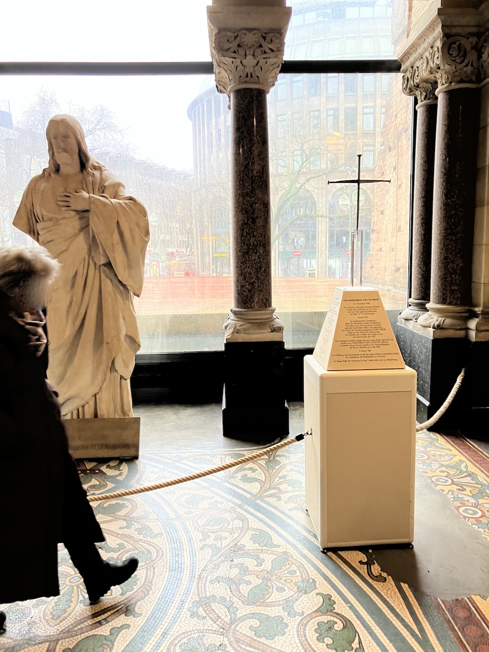 Nach der Lesung verlasse ich das Europacenter und betrete den Breitscheidtplatz. Ich hätte gestern hier sein sollen, nun bin ich es heute. Das ist die Gelegenheit, in die Ruine zu gehen. Und ich mach´s. Die Gedenkhalle ist voller Menschen. Boden, Gewölbedecke und Wände sind voller Bildergeschichten. Eine Jesus-Statue steht auf der einen Seite, daneben das Nagelkreuz von Coventry. Hinter dem Souvenirshop-Counter stehen zwei Stadtmodelle. Hier wird es eng, und man schiebt sich um die großen Glaskästen herum. Ein Modell zeigt den Auguste-Viktoria-Platz, wie er mit der intakten Kaiser-Wilhelm-Gedächtniskirche vor dem Krieg aussah, das andere zeigt den Breitscheidtplatz, wie er mit dem „hohlen Zahn“ und mit „Lippenstift und Puderdose“, den Neubauten Egon Eiermanns, heute aussieht. Im ersten Modell erblicke ich auch das „Romanische Café“. Über unseren Köpfen ziehen sich zwei schwebende Treppen ins Obergeschoss hinauf. Eine Glastür versperrt den Zugang. Mehr ist vom Turm nicht zu sehen.