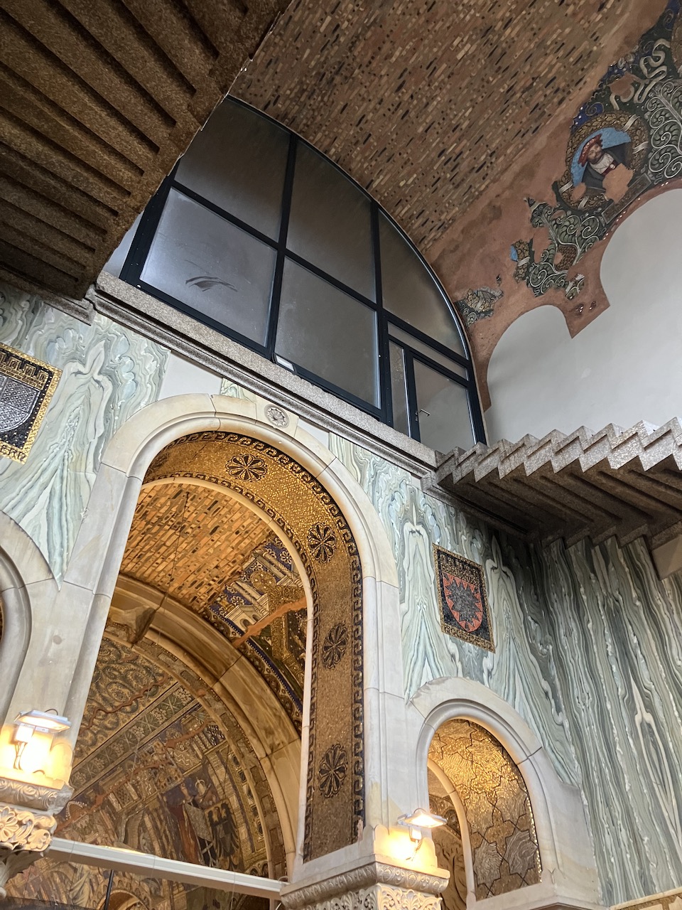 Wanddekorationen, Wandbilder in einer Kirche, Treppen an den Wänden.